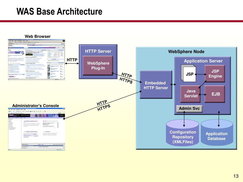Node 2 Node 1 App Server 1 App Server 3 Embedded HTTP Server (Port 9080) Embedded HTTP Server (Port 9080) App Server 4 App Server 2 Embedded HTTP Server (Port 9081) Embedded HTTP Server (Port 9081) Node Agent Node Agent Admin Svc Admin Svc Admin Svc Admin Svc Admin Svc Admin Svc Admin Svc ConfigurationRepository(XMLFiles) ConfigurationRepository(XMLFiles) MasterRepository(XMLFiles) WAS Network Deployment Architecture Web Browser WebSphere Cell HTTP Server WebSpherePlug-In Admin Node Administrator's Console Embedded HTTP Server (Port 9080) DeploymentManager