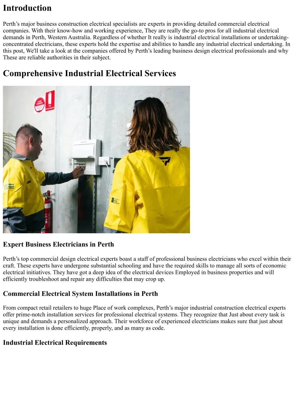 Introduction Perth’s major business construction electrical specialists are experts in providing detailed commercial electrical companies. With their know-how and working experience, They are really the go-to pros for all industrial electrical demands in Perth, Western Australia. Regardless of whether It really is industrial electrical installations or undertaking- concentrated electricians, these experts hold the expertise and abilities to handle any industrial electrical undertaking. In this post, We'll take a look at the companies offered by Perth’s leading business design electrical professionals and why These are reliable authorities in their subject. Comprehensive Industrial Electrical Services Expert Business Electricians in Perth Perth’s top commercial design electrical experts boast a staff of professional business electricians who excel within their craft. These experts have undergone substantial schooling and have the required skills to manage all sorts of economic electrical initiatives. They have got a deep idea of the electrical devices Employed in business properties and will efficiently troubleshoot and repair any difficulties that may crop up. Commercial Electrical System Installations in Perth From compact retail retailers to huge Place of work complexes, Perth’s major industrial construction electrical experts offer prime-notch installation services for professional electrical systems. They recognize that Just about every task is unique and demands a personalized approach. Their workforce of experienced electricians makes sure that just about every installation is done efficiently, properly, and as many as code. Industrial Electrical Requirements