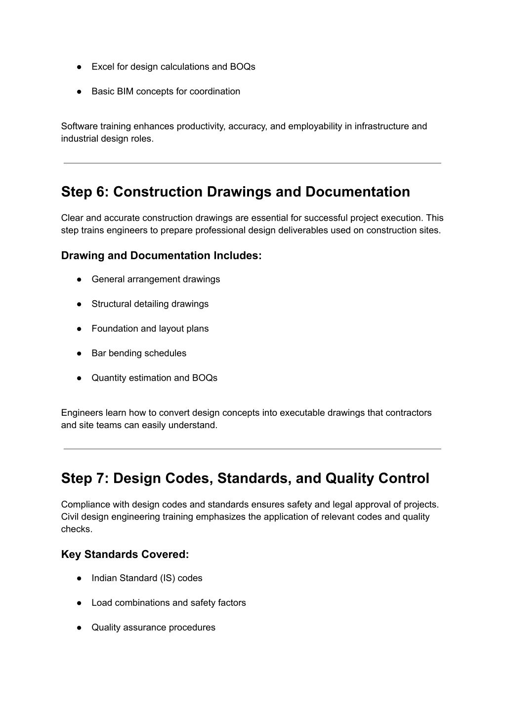 5. ● Excel for design calculations and BOQs ● Basic BIM concepts for coordination Software training enhances productivity, accuracy, and employability in infrastructure and industrial design roles. Step 6: Construction Drawings and Documentation Clear and accurate construction drawings are essential for successful project execution. This step trains engineers to prepare professional design deliverables used on construction sites. Drawing and Documentation Includes: ● General arrangement drawings ● Structural detailing drawings ● Foundation and layout plans ● Bar bending schedules ● Quantity estimation and BOQs Engineers learn how to convert design concepts into executable drawings that contractors and site teams can easily understand. Step 7: Design Codes, Standards, and Quality Control Compliance with design codes and standards ensures safety and legal approval of projects. Civil design engineering training emphasizes the application of relevant codes and quality checks. Key Standards Covered: ● Indian Standard (IS) codes ● Load combinations and safety factors ● Quality assurance procedures