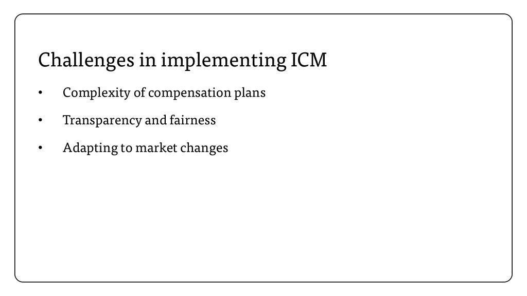 Challenges in implementing ICM Complexity of compensation plans • Transparency and fairness • Adapting to market changes •