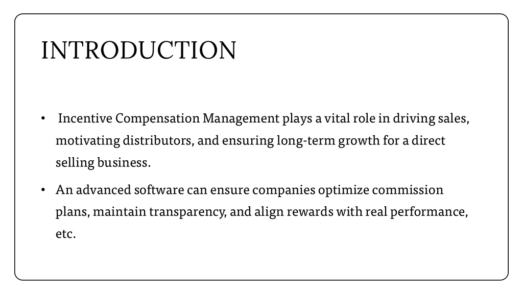 INTRODUCTION Incentive Compensation Management plays a vital role in driving sales, motivating distributors, and ensuring long-term growth for a direct selling business. • • An advanced software can ensure companiesoptimize commission plans, maintain transparency, and align rewards with real performance, etc.