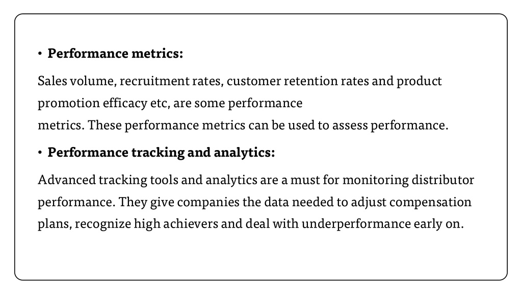 • Performance metrics: Sales volume, recruitment rates, customer retention rates and product promotion efficacy etc, are some performance metrics. Theseperformance metrics can be used to assess performance. • Performance tracking and analytics: Advanced tracking tools and analytics are a must for monitoring distributor performance. They give companies the data needed to adjust compensation plans, recognize high achievers and deal with underperformance early on.