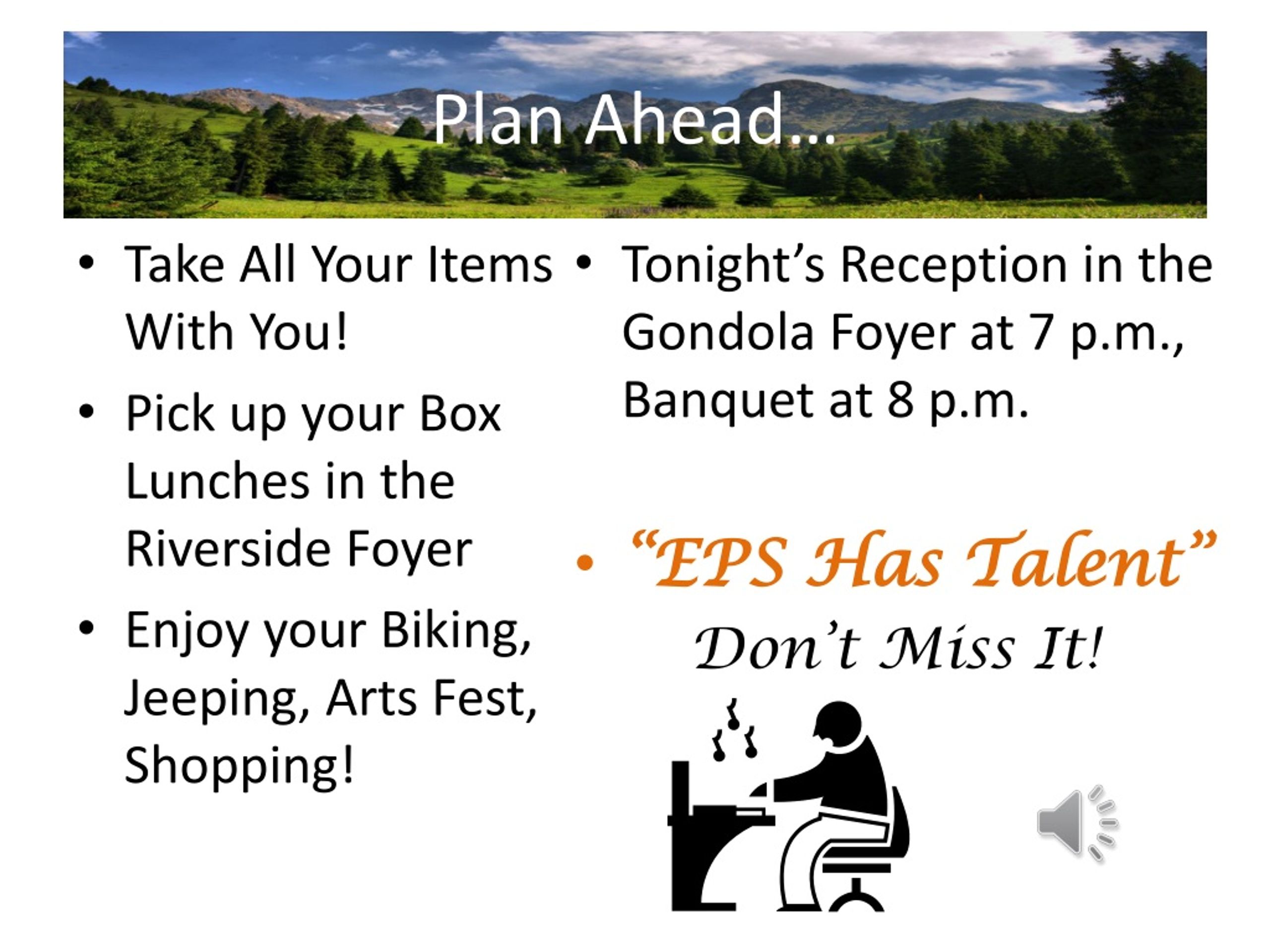 Plan Ahead… • Take All Your Items With You! • Pick up your Box Lunches in the Riverside Foyer • Enjoy your Biking, Jeeping, Arts Fest, Shopping! • Tonight’s Reception in the Gondola Foyer at 7 p.m., Banquet at 8 p.m. • “EPS Has Talent” Don’t Miss It!