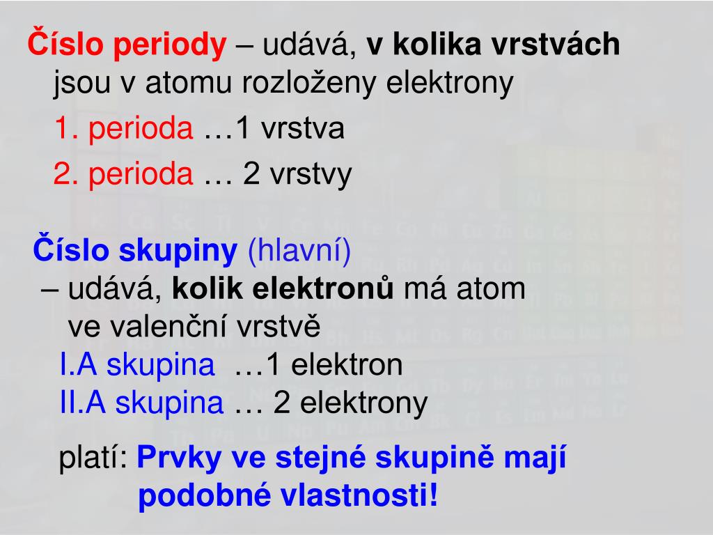 Číslo skupiny(hlavní)– udává, kolik elektronů má atomve valenční vrstvě I.A skupina …1 elektron II.A skupina … 2 elektrony platí: Prvky ve stejné skupině mají podobné vlastnosti! Číslo periody – udává, v kolika vrstvách jsou v atomu rozloženy elektrony 1. perioda …1 vrstva 2. perioda … 2 vrstvy