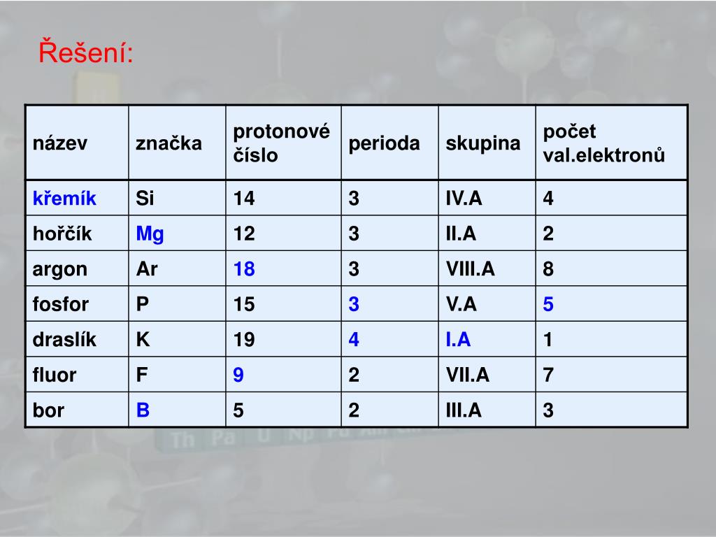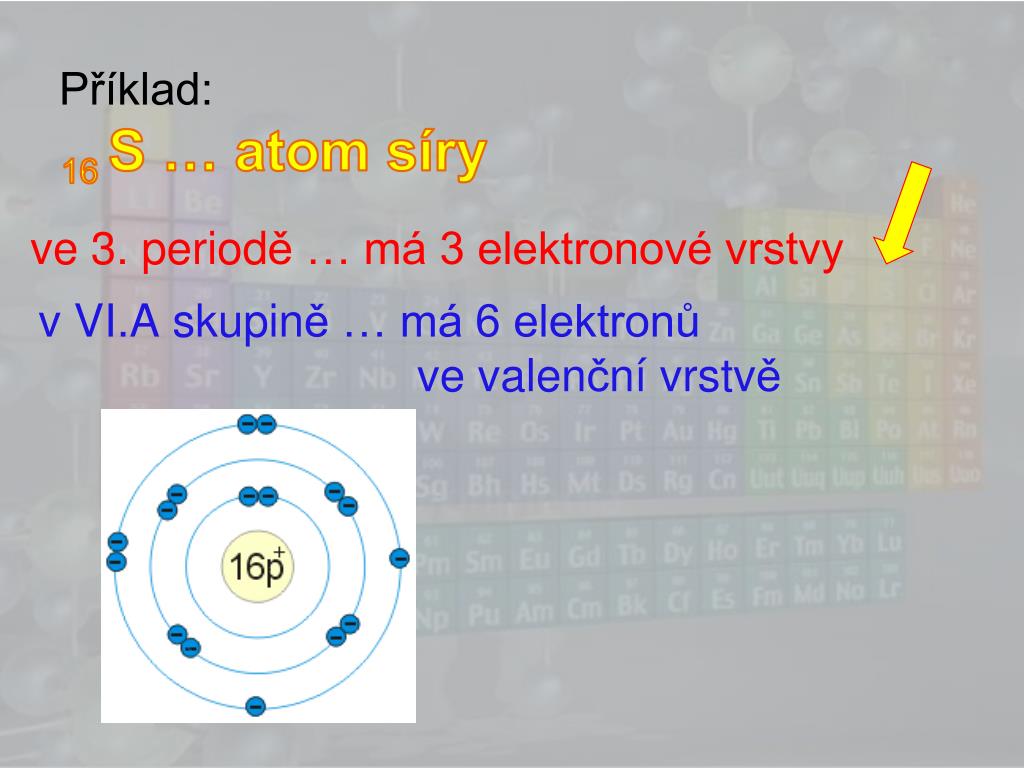 Příklad: 16 S … atom síry ve 3. periodě … má 3 elektronové vrstvy • v VI.A skupině … má 6 elektronů • ve valenční vrstvě