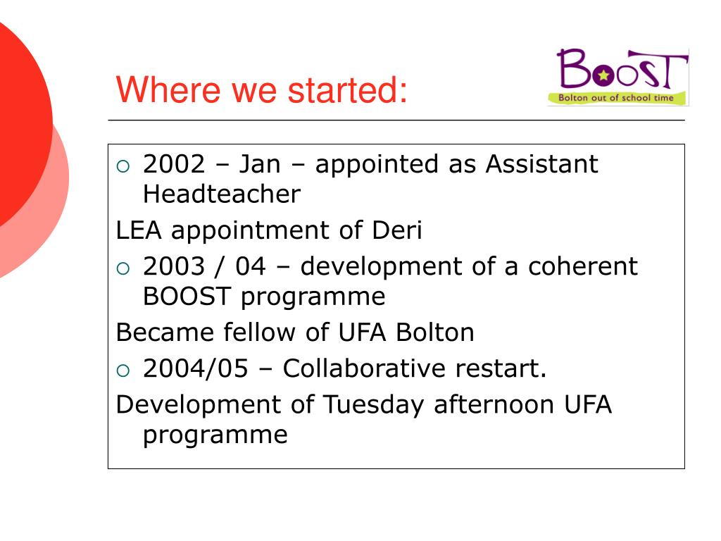 Where we started: • 2002 – Jan – appointed as Assistant Headteacher LEA appointment of Deri • 2003 / 04 – development of a coherent BOOST programme Became fellow of UFA Bolton • 2004/05 – Collaborative restart. Development of Tuesday afternoon UFA programme