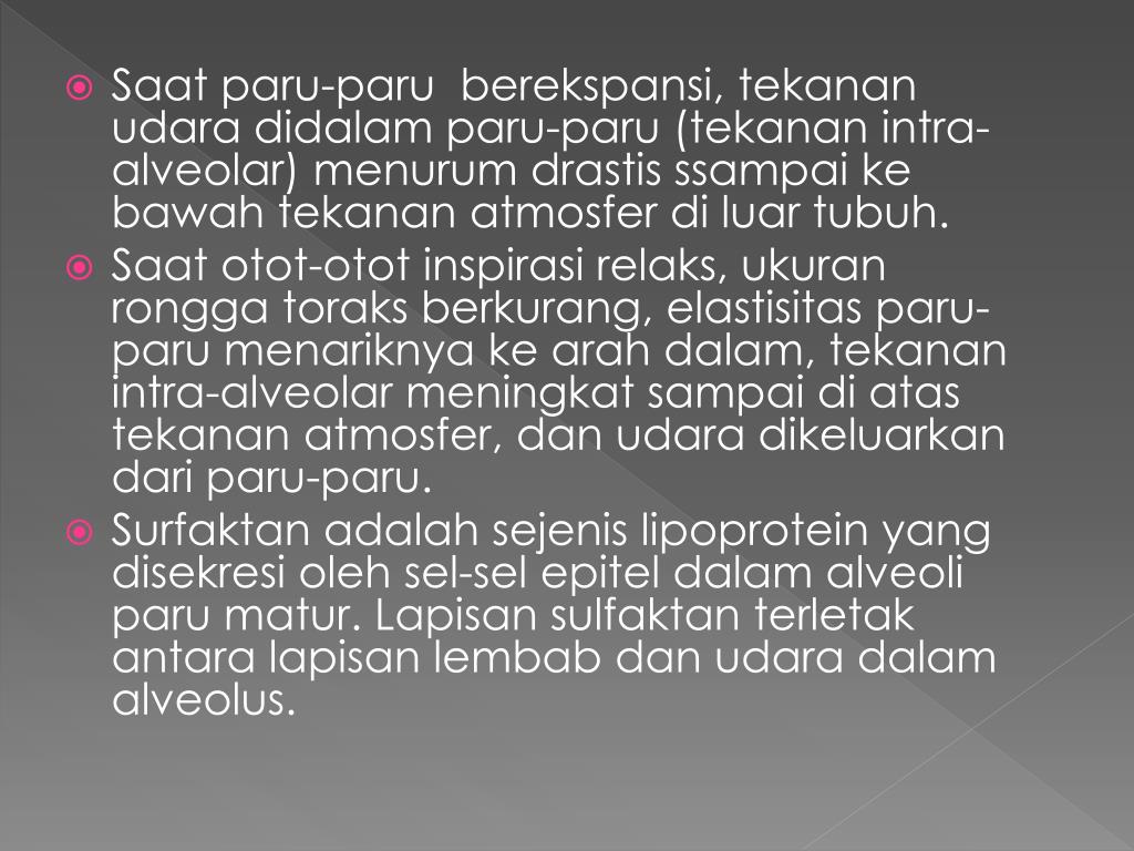 Saatparu-paruberekspansi, tekananudaradidalamparu-paru (tekanan intra-alveolar) menurumdrastisssampaikebawahtekananatmosferdiluartubuh. • Saatotot-ototinspirasirelaks, ukuranronggatoraksberkurang, elastisitasparu-parumenariknyakearahdalam, tekanan intra-alveolar meningkatsampaidiatastekananatmosfer, danudaradikeluarkandariparu-paru. • Surfaktanadalahsejenis lipoprotein yang disekresiolehsel-selepiteldalam alveoli parumatur. Lapisansulfaktanterletakantaralapisanlembabdanudaradalam alveolus.
