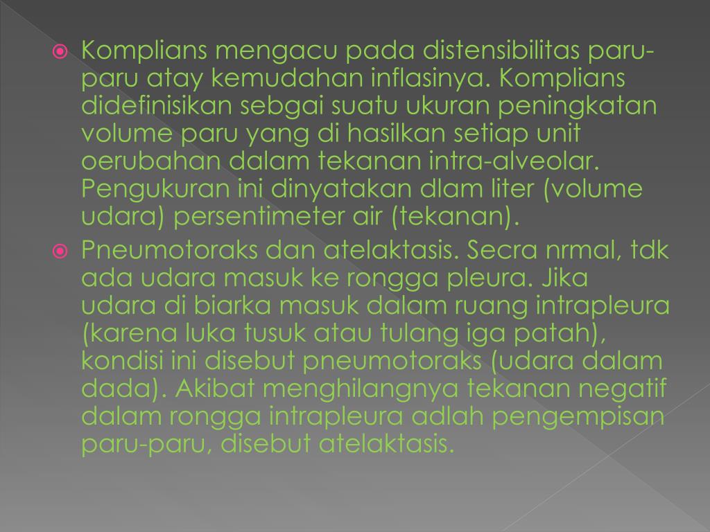 Kompliansmengacupadadistensibilitasparu-paruataykemudahaninflasinya. Kompliansdidefinisikansebgaisuatuukuranpeningkatan volume paru yang dihasilkansetiap unit oerubahandalamtekanan intra-alveolar. Pengukuraninidinyatakandlam liter (volume udara) persentimeter air (tekanan). • Pneumotoraksdanatelaktasis. Secranrmal, tdkadaudaramasukkerongga pleura. Jikaudaradibiarkamasukdalamruangintrapleura (karenalukatusukatautulangigapatah), kondisiinidisebutpneumotoraks (udaradalam dada). Akibatmenghilangnyatekanannegatifdalamronggaintrapleuraadlahpengempisanparu-paru, disebutatelaktasis.
