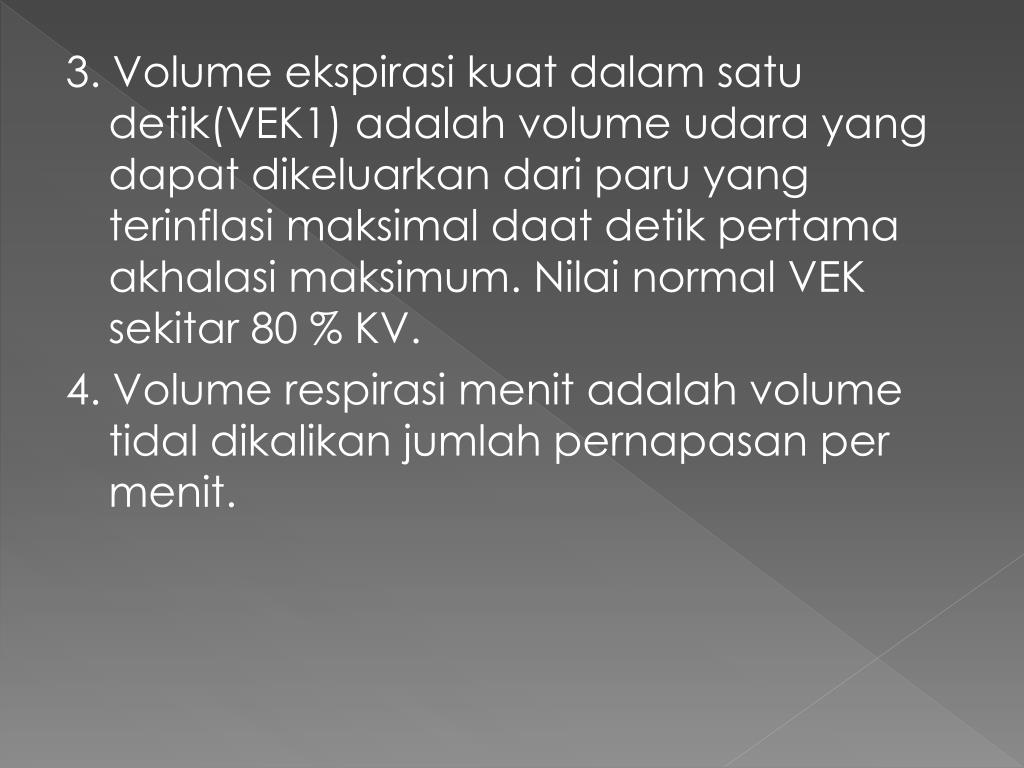 3. Volume ekspirasi kuat dalam satu detik(VEK1) adalah volume udara yang dapat dikeluarkan dari paru yang terinflasi maksimal daat detik pertama akhalasi maksimum. Nilai normal VEK sekitar 80 % KV. 4. Volume respirasi menit adalah volume tidal dikalikan jumlah pernapasan per menit.