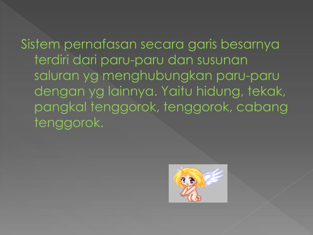 Sistem pernafasan secara garis besarnya terdiri dari paru-paru dan susunan saluran yg menghubungkan paru-paru dengan yg lainnya. Yaitu hidung, tekak, pangkal tenggorok, tenggorok, cabang tenggorok.