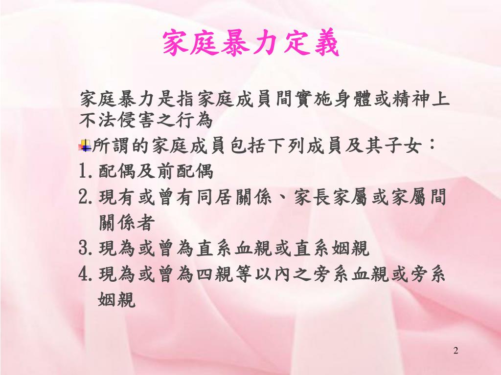家庭暴力定義 家庭暴力是指家庭成員間實施身體或精神上不法侵害之行為 所謂的家庭成員包括下列成員及其子女: 1.配偶及前配偶 2.現有或曾有同居關係、家長家屬或家屬間 關係者 3.現為或曾為直系血親或直系姻親 4.現為或曾為四親等以內之旁系血親或旁系 姻親