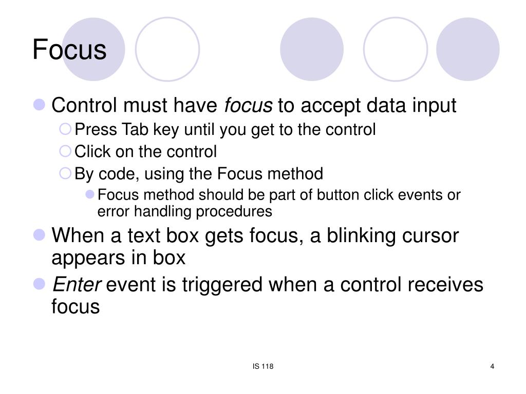Focus • Control must have focus to accept data input • Press Tab key until you get to the control • Click on the control • By code, using the Focus method • Focus method should be part of button click events or error handling procedures • When a text box gets focus, a blinking cursor appears in box • Enter event is triggered when a control receives focus IS 118