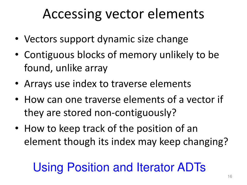 Accessing vector elements • Vectors support dynamic size change • Contiguous blocks of memory unlikely to be found, unlike array • Arrays use index to traverse elements • How can one traverse elements of a vector if they are stored non-contiguously? • How to keep track of the position of an element though its index may keep changing? Using Position and Iterator ADTs
