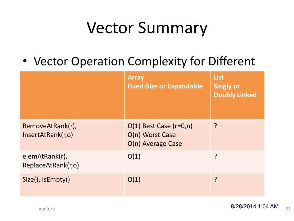 Vector Summary • Vector Operation Complexity for Different Implementations Vectors
