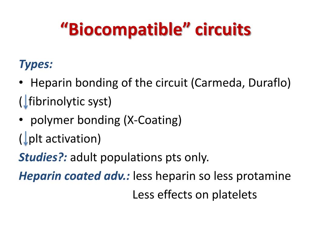 “Biocompatible” circuits Types: • Heparin bonding of the circuit (Carmeda, Duraflo) ( fibrinolyticsyst) • polymer bonding (X-Coating) ( plt activation) Studies?: adult populations pts only. Heparin coated adv.:less heparin so less protamine Less effects on platelets