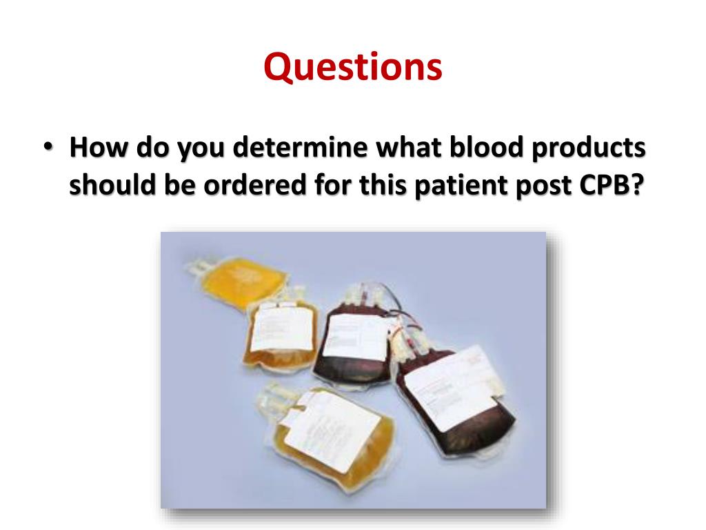 Questions • How do you determine what blood products should be ordered for this patient post CPB?