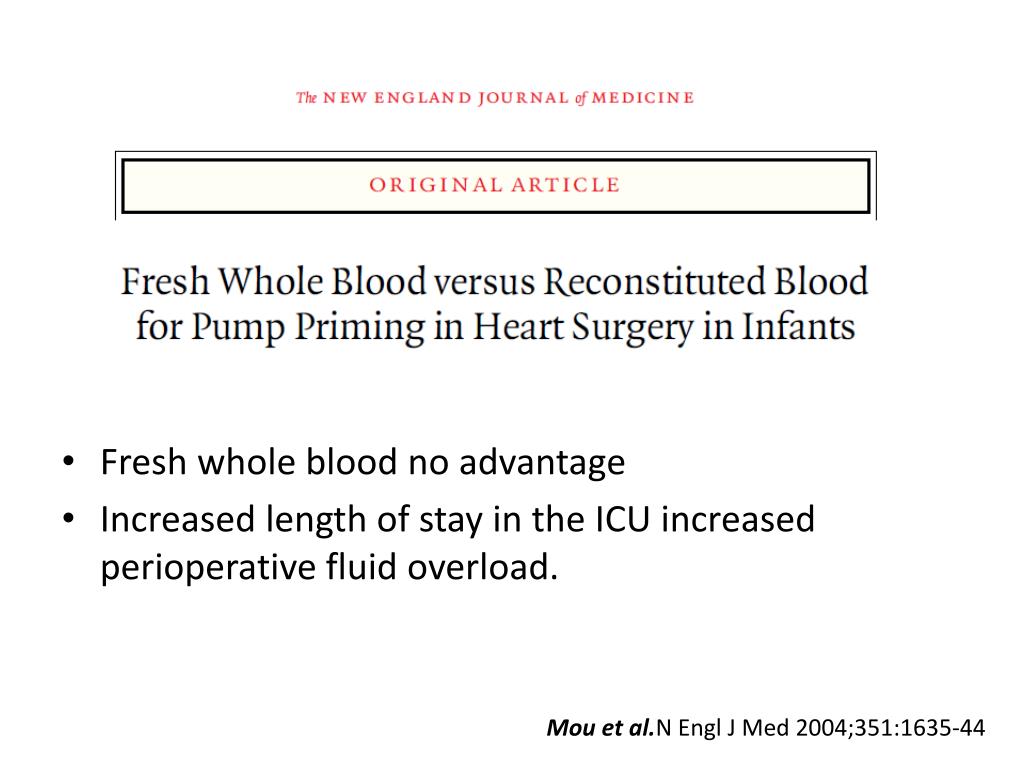 Fresh whole blood no advantage • Increased length of stay in the ICU increased perioperative fluid overload. Mou et al.NEngl J Med 2004;351:1635-44