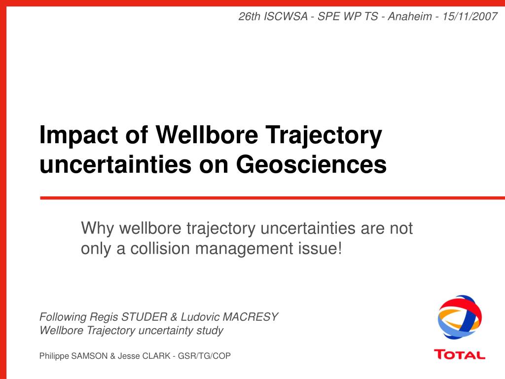 Why wellbore trajectory uncertainties are not only a collision management issue! 26th ISCWSA - SPE WP TS - Anaheim - 15/11/2007 Impact of Wellbore Trajectory uncertainties on Geosciences Following Regis STUDER & Ludovic MACRESYWellbore Trajectory uncertainty study Philippe SAMSON & Jesse CLARK - GSR/TG/COP