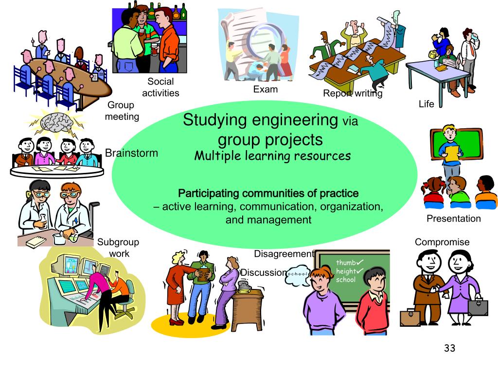 Multiple learning resources Social activities Exam Report writing Studying engineering via group projects Life Group meeting Brainstorm Participating communities of practice – active learning, communication, organization, and management Presentation Subgroup work Compromise Disagreement Discussion