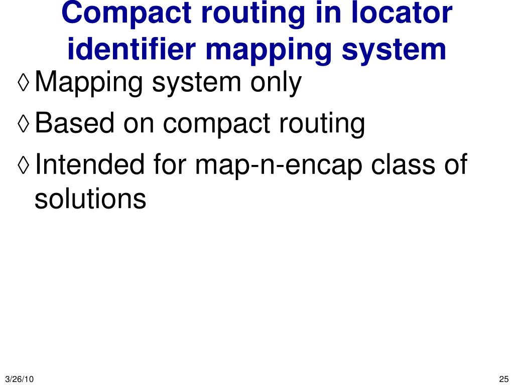 Compact routing in locator identifier mapping system Mapping system only Based on compact routing Intended for map-n-encap class of solutions
