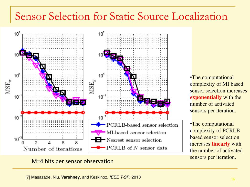 Sensor Selection for Static Source Localization • The computational complexity of MI based sensor selection increases exponentially with the number of activated sensors per iteration. • The computational complexity of PCRLB based sensor selection • increases linearly with the number of activated sensors per iteration. M=4 bits per sensor observation 16 [7] Masazade, Niu, Varshney, and Keskinoz, IEEE T-SP, 2010