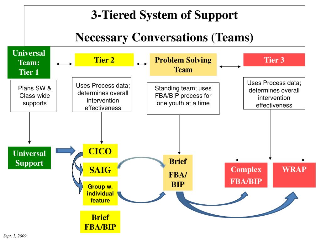 3-Tiered System of Support Necessary Conversations (Teams) UniversalTeam: Tier 1 Tier 2 Problem Solving Team Tier 3 Uses Process data; determines overall intervention effectiveness Uses Process data; determines overall intervention effectiveness Plans SW & Class-wide supports Standing team; uses FBA/BIP process for one youth at a time CICO Universal Support Brief FBA/BIP SAIG Complex FBA/BIP WRAP Group w. individual feature Brief FBA/BIP Sept. 1, 2009