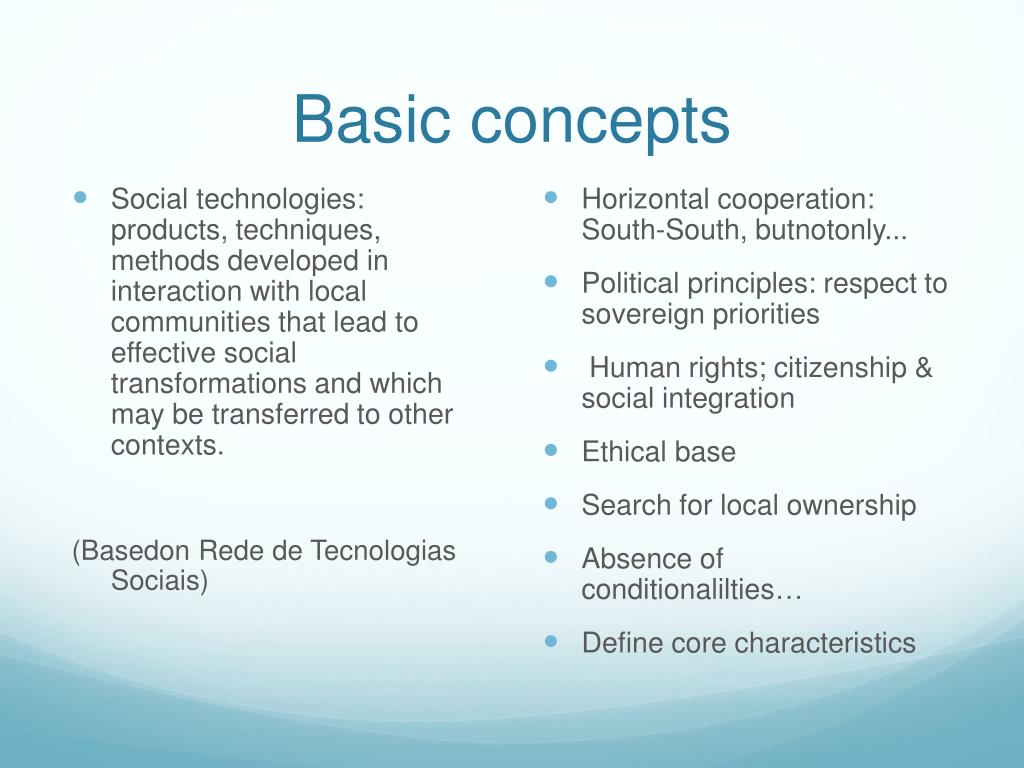 Basicconcepts • Social technologies: products, techniques, methods developed in interaction with local communities that lead to effective social transformations and which may be transferred to other contexts. (Basedon Rede de Tecnologias Sociais) • Horizontal cooperation: South-South, butnotonly... • Political principles: respect to sovereign priorities • Human rights; citizenship & social integration • Ethical base • Search for local ownership • Absence of conditionalilties… • Define core characteristics