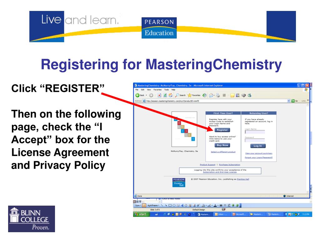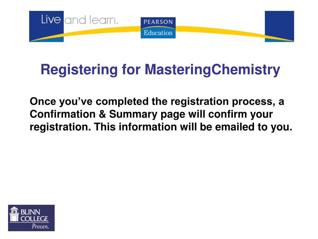 Registering for MasteringChemistry Once you’ve completed the registration process, a Confirmation & Summary page will confirm your registration. This information will be emailed to you.