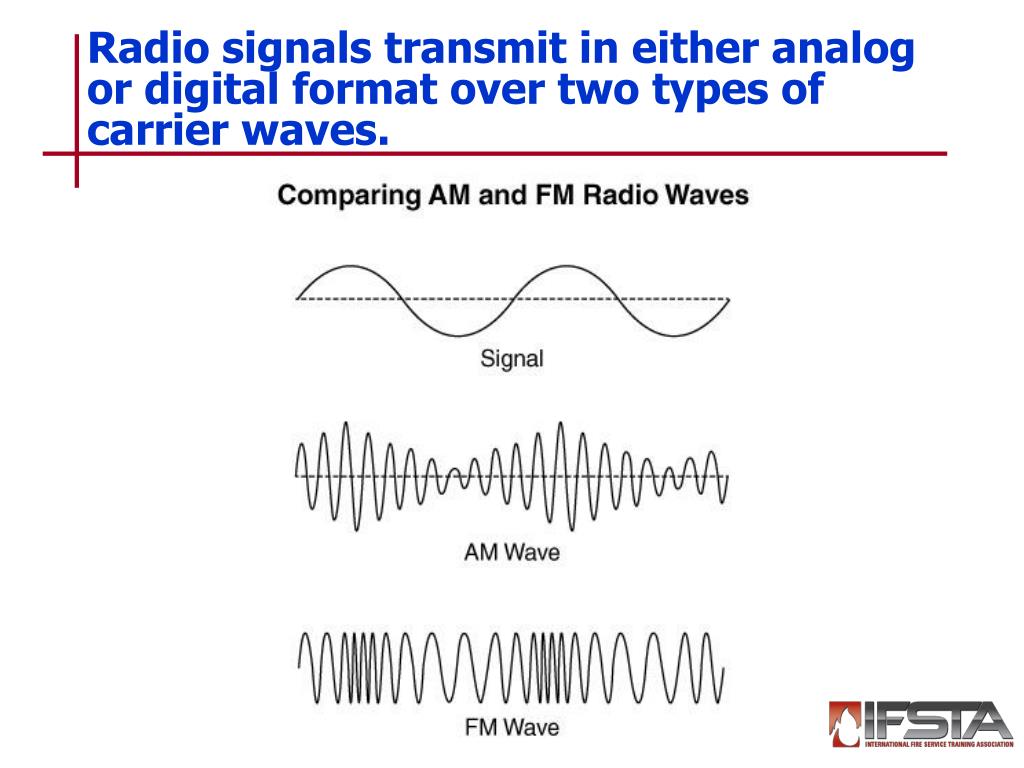 Radio signals transmit in either analog or digital format over two types of carrier waves.