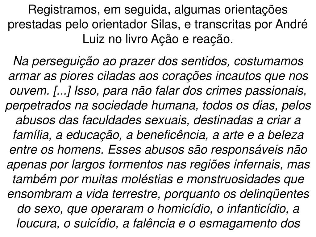 Registramos, em seguida, algumas orientações prestadas pelo orientador Silas, e transcritas por André Luiz no livro Ação e reação. Na perseguição ao prazer dos sentidos, costumamos armar as piores ciladas aos corações incautos que nos ouvem. [...] Isso, para não falar dos crimes passionais, perpetrados na sociedade humana, todos os dias, pelos abusos das faculdades sexuais, destinadas a criar a família, a educação, a beneficência, a arte e a beleza entre os homens. Esses abusos são responsáveis não apenas por largos tormentos nas regiões infernais, mas também por muitas moléstias e monstruosidades que ensombram a vida terrestre, porquanto os delinqüentes do sexo, que operaram o homicídio, o infanticídio, a loucura, o suicídio, a falência e o esmagamento dos