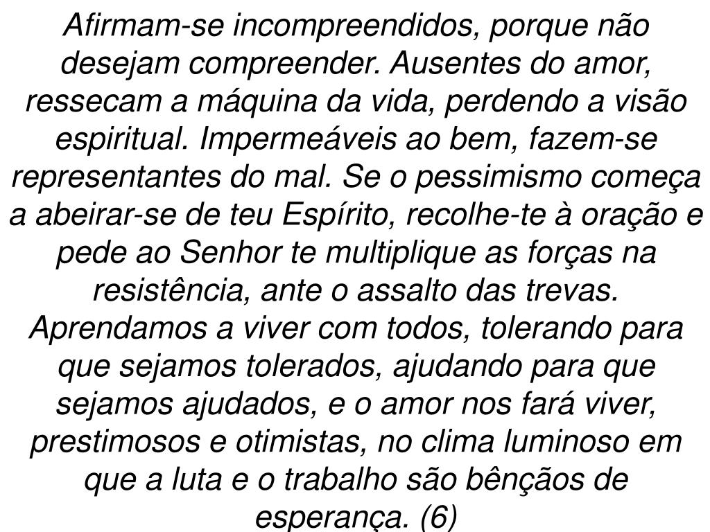 Afirmam-se incompreendidos, porque não desejam compreender. Ausentes do amor, ressecam a máquina da vida, perdendo a visão espiritual. Impermeáveis ao bem, fazem-se representantes do mal. Se o pessimismo começa a abeirar-se de teu Espírito, recolhe-te à oração e pede ao Senhor te multiplique as forças na resistência, ante o assalto das trevas. Aprendamos a viver com todos, tolerando para que sejamos tolerados, ajudando para que sejamos ajudados, e o amor nos fará viver, prestimosos e otimistas, no clima luminoso em que a luta e o trabalho são bênçãos de esperança. (6)