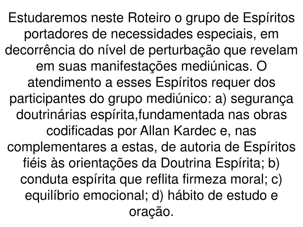 Estudaremos neste Roteiro o grupo de Espíritos portadores de necessidades especiais, em decorrência do nível de perturbação que revelam em suas manifestações mediúnicas. O atendimento a esses Espíritos requer dos participantes do grupo mediúnico: a) segurança doutrinárias espírita,fundamentada nas obras codificadas por Allan Kardec e, nas complementares a estas, de autoria de Espíritos fiéis às orientações da Doutrina Espírita; b) conduta espírita que reflita firmeza moral; c) equilíbrio emocional; d) hábito de estudo e oração.