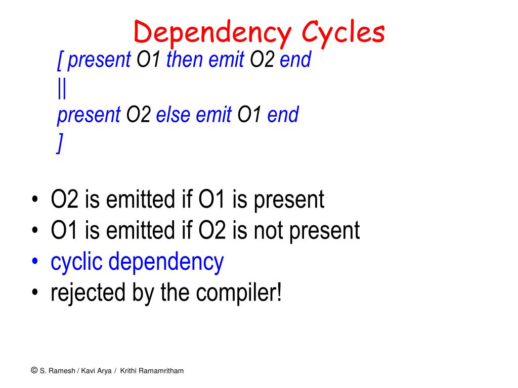 Dependency Cycles [ present O1 then emit O2 end || present O2 else emit O1 end ] • O2 is emitted if O1 is present • O1 is emitted if O2 is not present • cyclic dependency • rejected by the compiler!