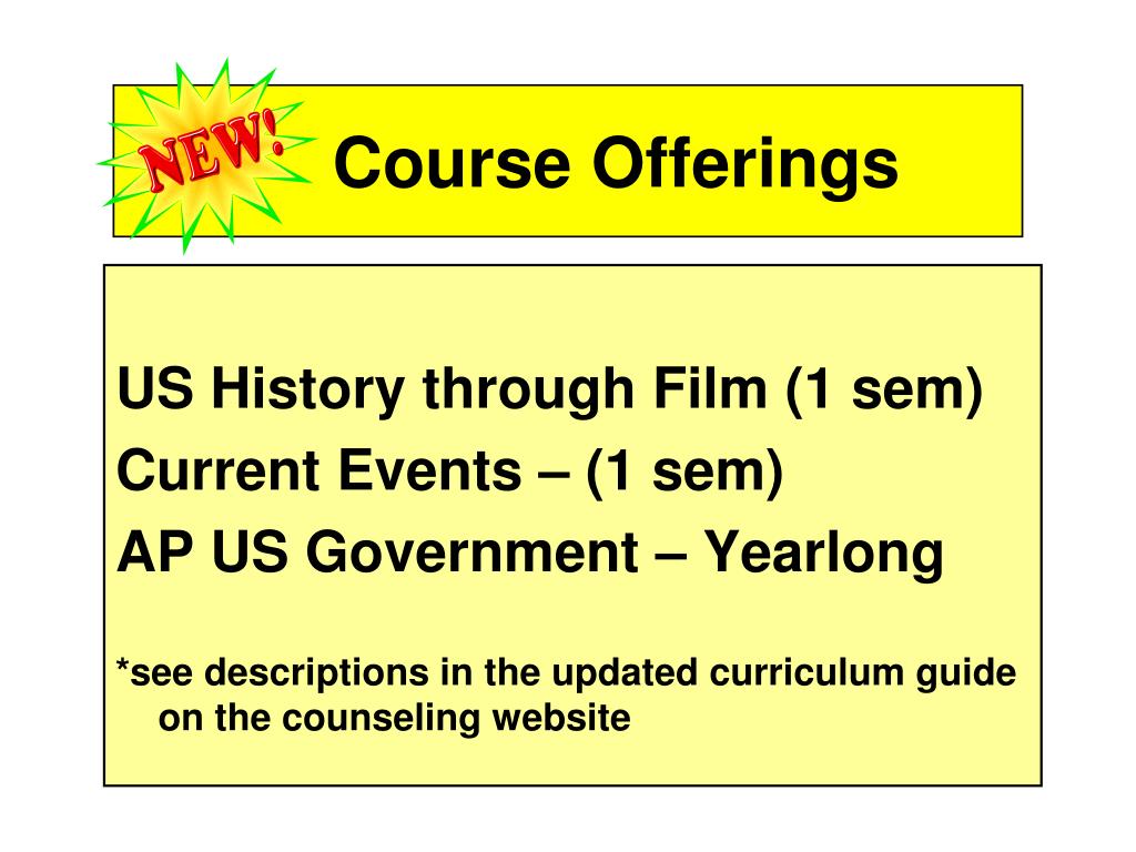 Course Offerings US History through Film (1 sem) Current Events – (1 sem) AP US Government – Yearlong *see descriptions in the updated curriculum guide on the counseling website