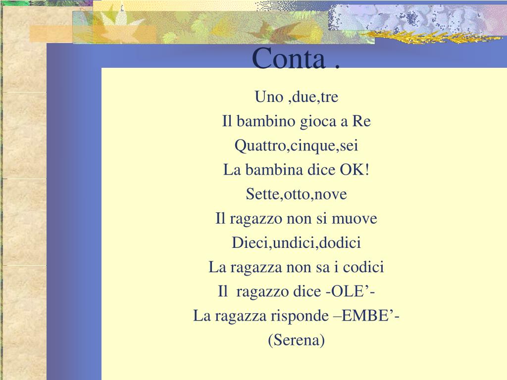 Conta . Uno ,due,tre Il bambino gioca a Re Quattro,cinque,sei La bambina dice OK! Sette,otto,nove Il ragazzo non si muove Dieci,undici,dodici La ragazza non sa i codici Il ragazzo dice -OLE’- La ragazza risponde –EMBE’- (Serena)