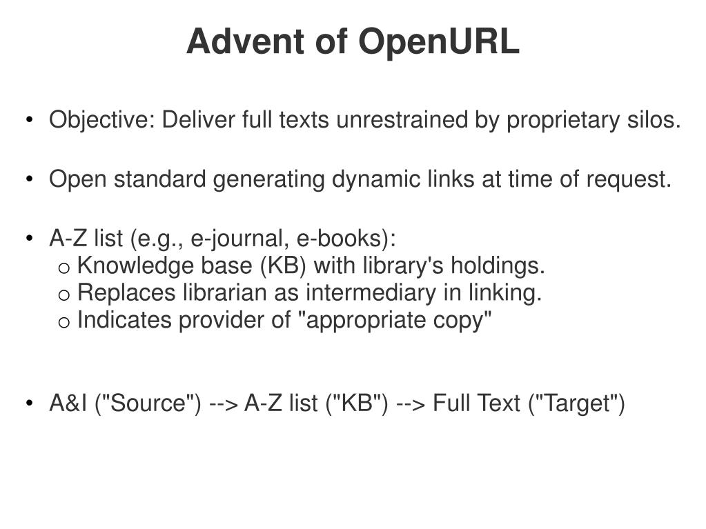 Advent of OpenURL • Objective: Deliver full texts unrestrained by proprietary silos. • Open standard generating dynamic links at time of request. • A-Z list (e.g., e-journal, e-books): • Knowledge base (KB) with library's holdings. • Replaces librarian as intermediary in linking. • Indicates provider of "appropriate copy" • A&I ("Source") --> A-Z list ("KB") --> Full Text ("Target")