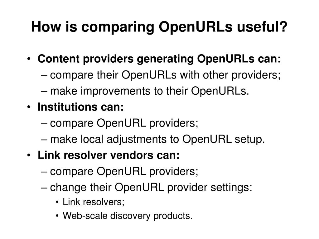 How is comparing OpenURLs useful? • Content providers generating OpenURLs can: • compare their OpenURLs with other providers; • make improvements to their OpenURLs. • Institutions can: • compare OpenURL providers; • make local adjustments to OpenURL setup. • Link resolver vendors can: • compare OpenURL providers; • change their OpenURL provider settings: • Link resolvers; • Web-scale discovery products.