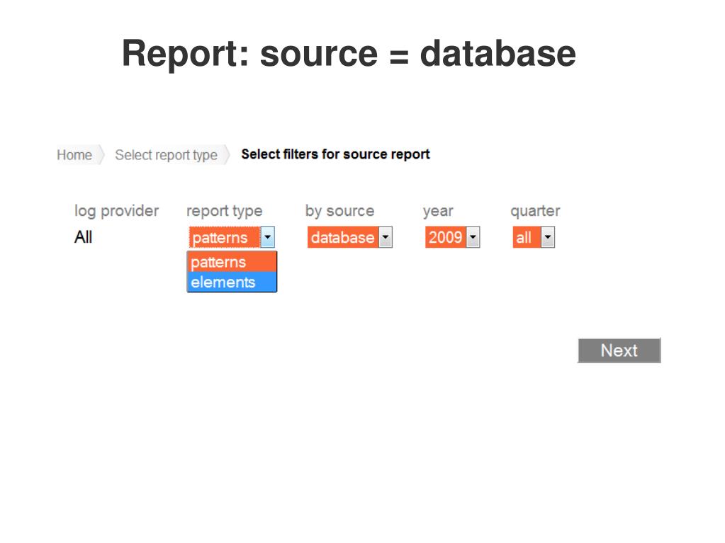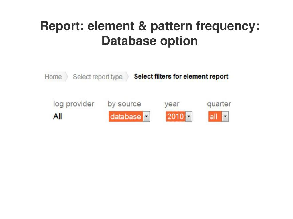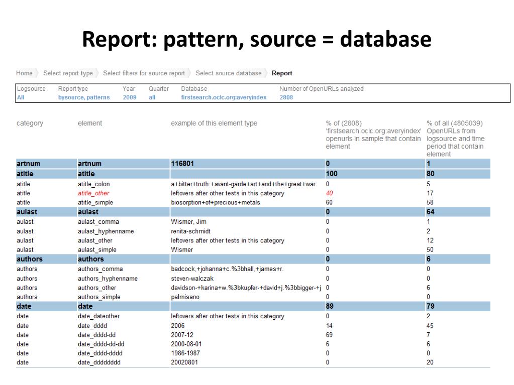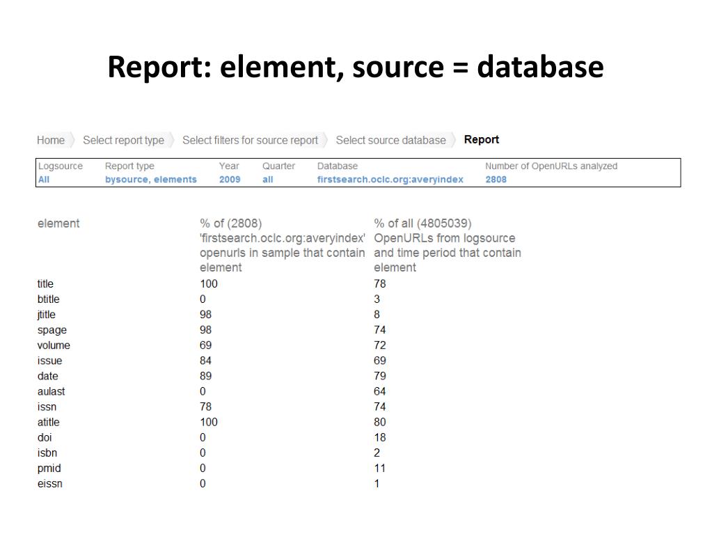 Report types • Source reports • Viewing how a particular (1) vendor or (2) database • A. uses OpenURL elements (element frequency) • B. formats OpenURL elements (pattern frequency) • Element / Pattern reports • Viewing how a particular (1) element or format • A. is used across vendors • B. is used across databases