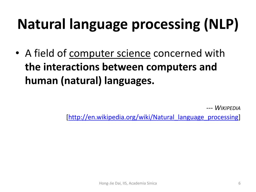 Natural language processing (NLP) • A field of computer science concerned with the interactions between computers and human (natural) languages.--- WIKIPEDIA [http://en.wikipedia.org/wiki/Natural_language_processing] Hong-Jie Dai, IIS, Academia Sinica