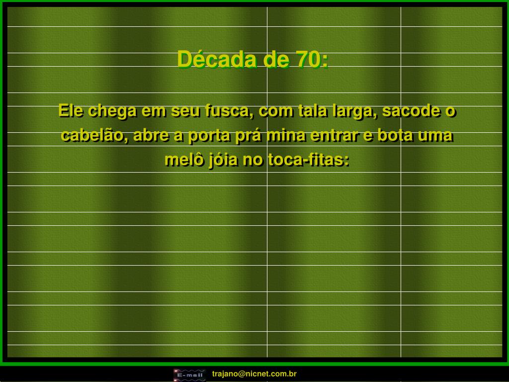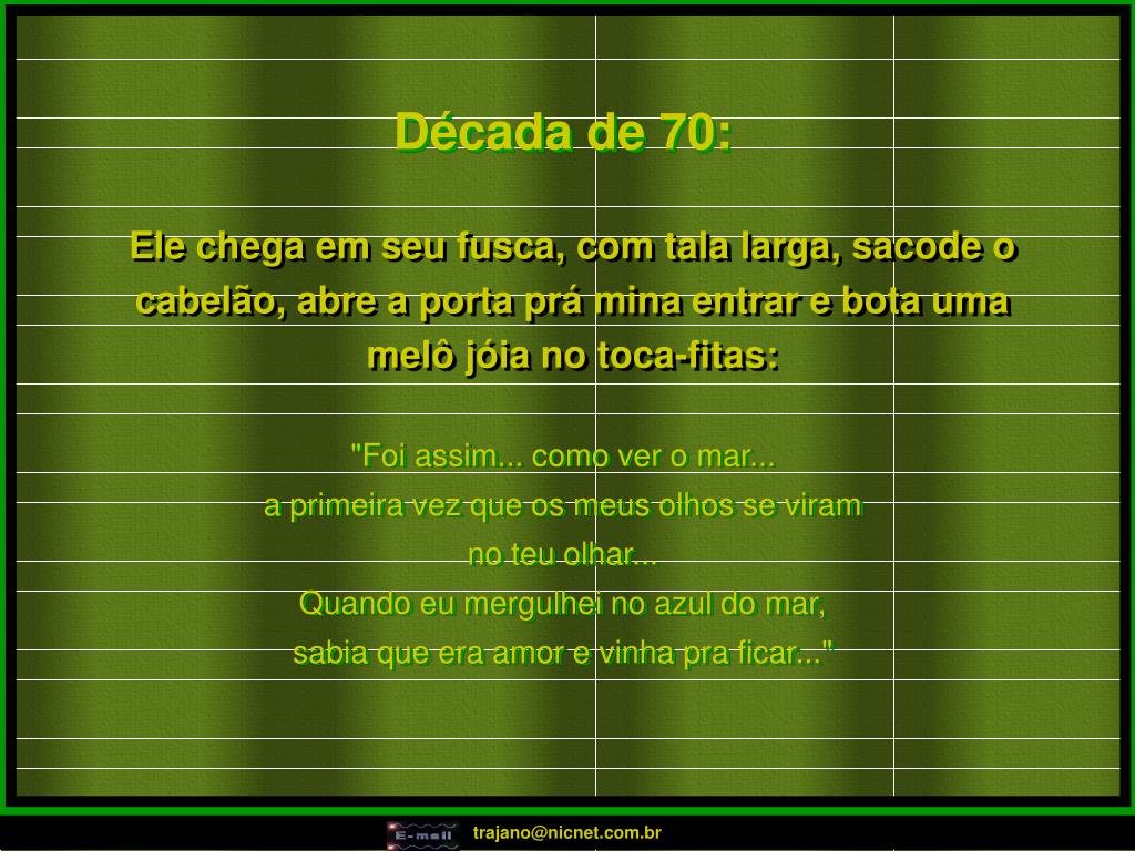 Década de 70: Ele chega em seu fusca, com tala larga, sacode o cabelão, abre a porta prá mina entrar e bota uma melô jóia no toca-fitas: "Foi assim... como ver o mar...a primeira vez que os meus olhos se viramno teu olhar...Quando eu mergulhei no azul do mar,sabia que era amor e vinha pra ficar..."