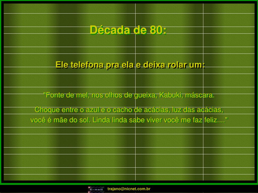 Década de 80: Ele telefona pra ela e deixa rolar um: "Fonte de mel, nos olhos de gueixa, Kabuki, máscara. Choque entre o azul e o cacho de acácias, luz das acácias, você é mãe do sol. Linda linda sabe viver você me faz feliz...."
