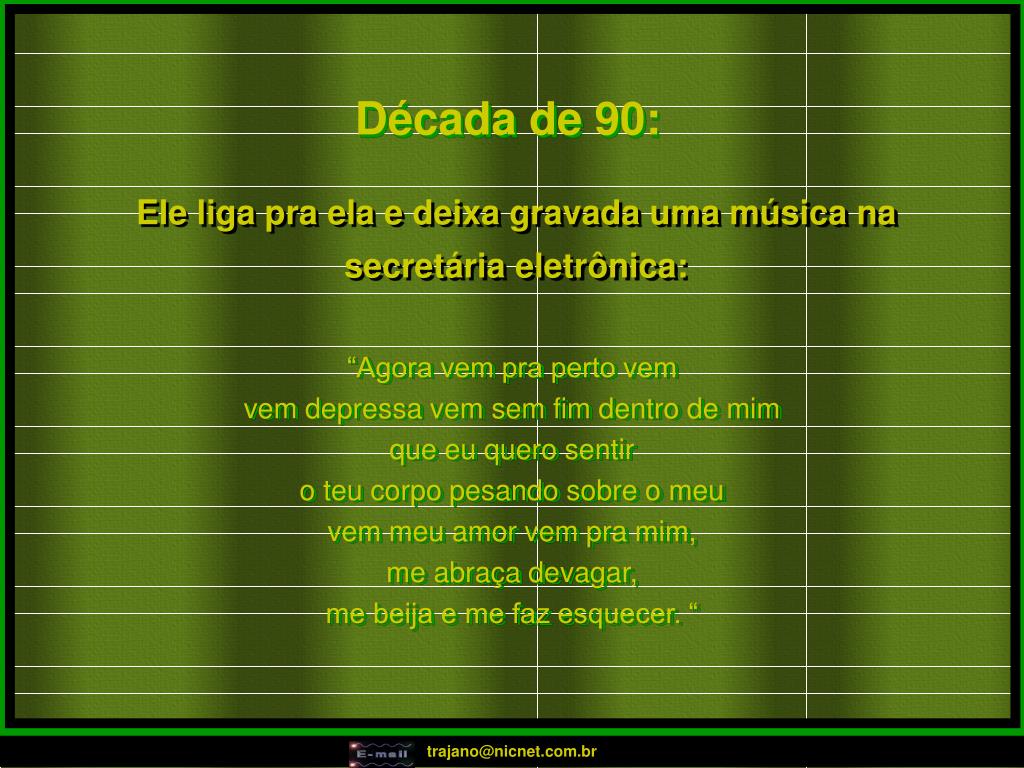 Década de 90: Ele liga pra ela e deixa gravada uma música na secretária eletrônica: “Agora vem pra perto vemvem depressa vem sem fim dentro de mimque eu quero sentiro teu corpo pesando sobre o meuvem meu amor vem pra mim,me abraça devagar,me beija e me faz esquecer. “
