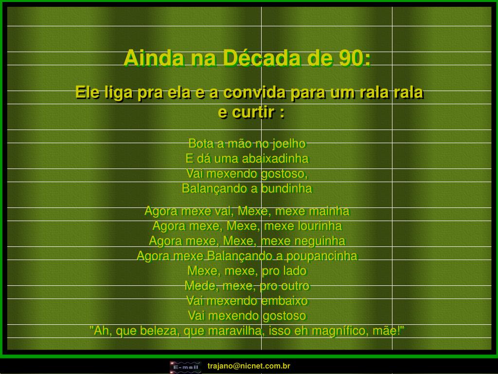 Ainda na Década de 90: Ele liga pra ela e a convida para um rala rala e curtir : Bota a mão no joelhoE dá uma abaixadinhaVai mexendo gostoso,Balançando a bundinha Agora mexe vai, Mexe, mexe mainhaAgora mexe, Mexe, mexe lourinhaAgora mexe, Mexe, mexe neguinhaAgora mexe Balançando a poupancinhaMexe, mexe, pro ladoMede, mexe, pro outroVai mexendo embaixoVai mexendo gostoso"Ah, que beleza, que maravilha, isso eh magnífico, mãe!"