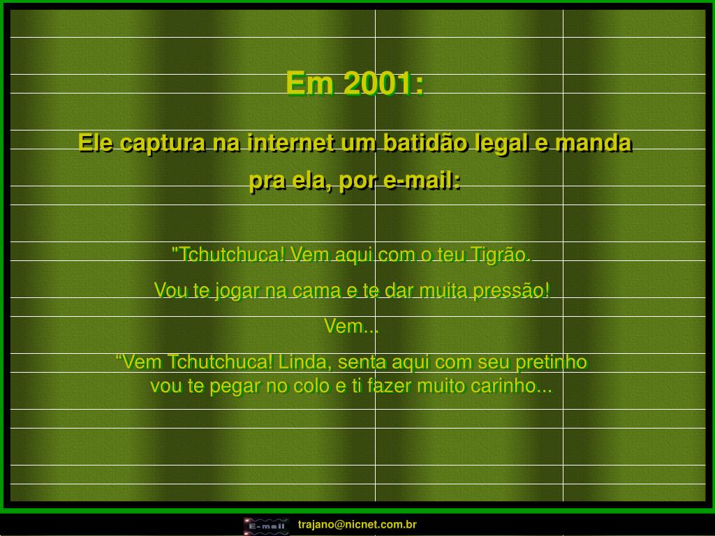 Em 2001: Ele captura na internet um batidão legal e manda pra ela, por e-mail: "Tchutchuca! Vem aqui com o teu Tigrão. Vou te jogar na cama e te dar muita pressão! Vem... “Vem Tchutchuca! Linda, senta aqui com seu pretinho vou te pegar no colo e ti fazer muito carinho...