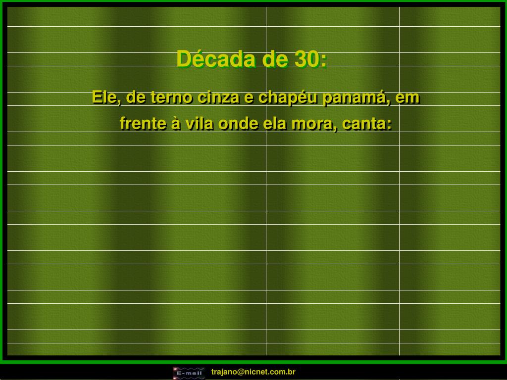 DECADÊNCIA DO ROMANTISMO. Fonte: internet – Desconheço o Autor. CLICK O MOUSE. Década de 30:. Ele, de terno cinza e chapéu panamá, em frente à vila onde ela mora, canta:. Década de 30:. Ele, de terno cinza e chapéu panamá, em frente à vila onde ela mora, canta:.