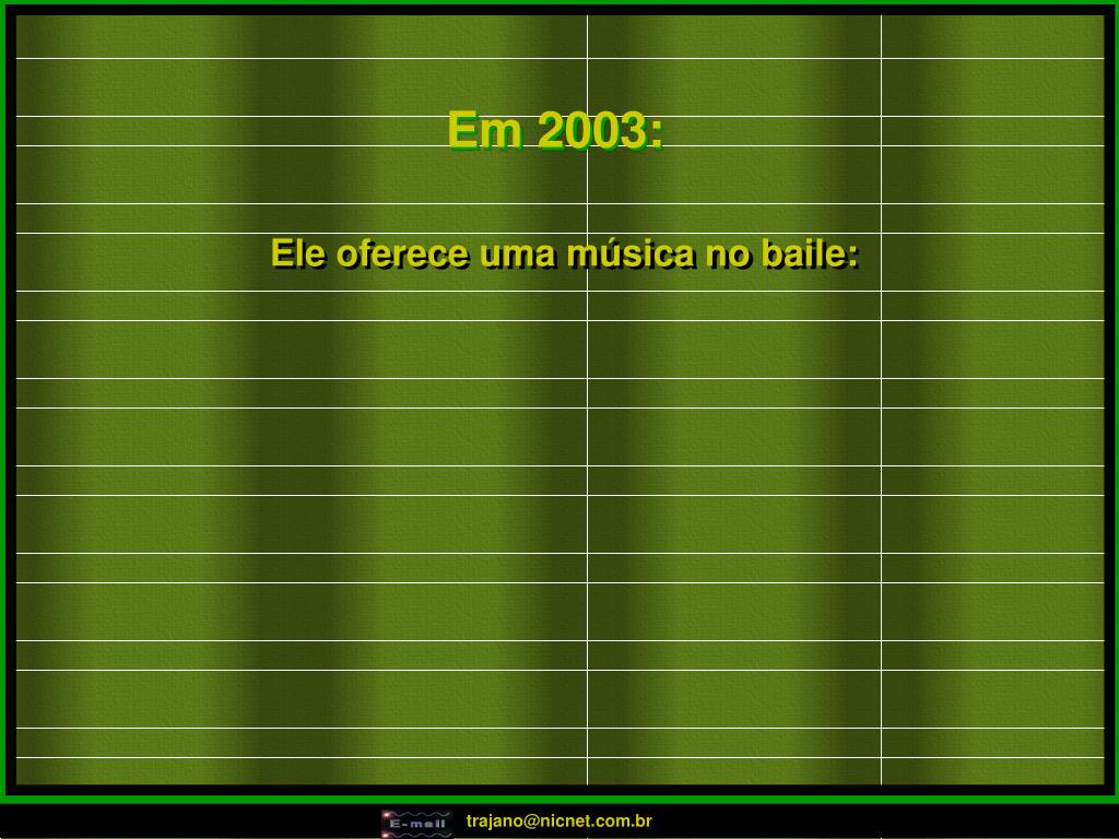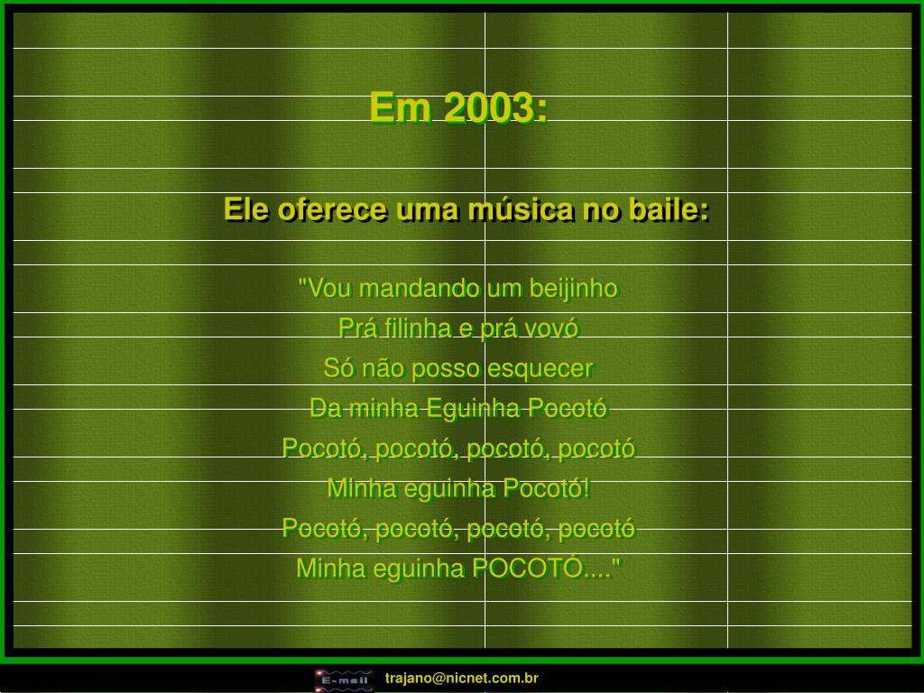 Em 2003: Ele oferece uma música no baile: "Vou mandando um beijinhoPrá filinha e prá vovóSó não posso esquecerDa minha Eguinha PocotóPocotó, pocotó, pocotó, pocotóMinha eguinha Pocotó!Pocotó, pocotó, pocotó, pocotóMinha eguinha POCOTÓ...."