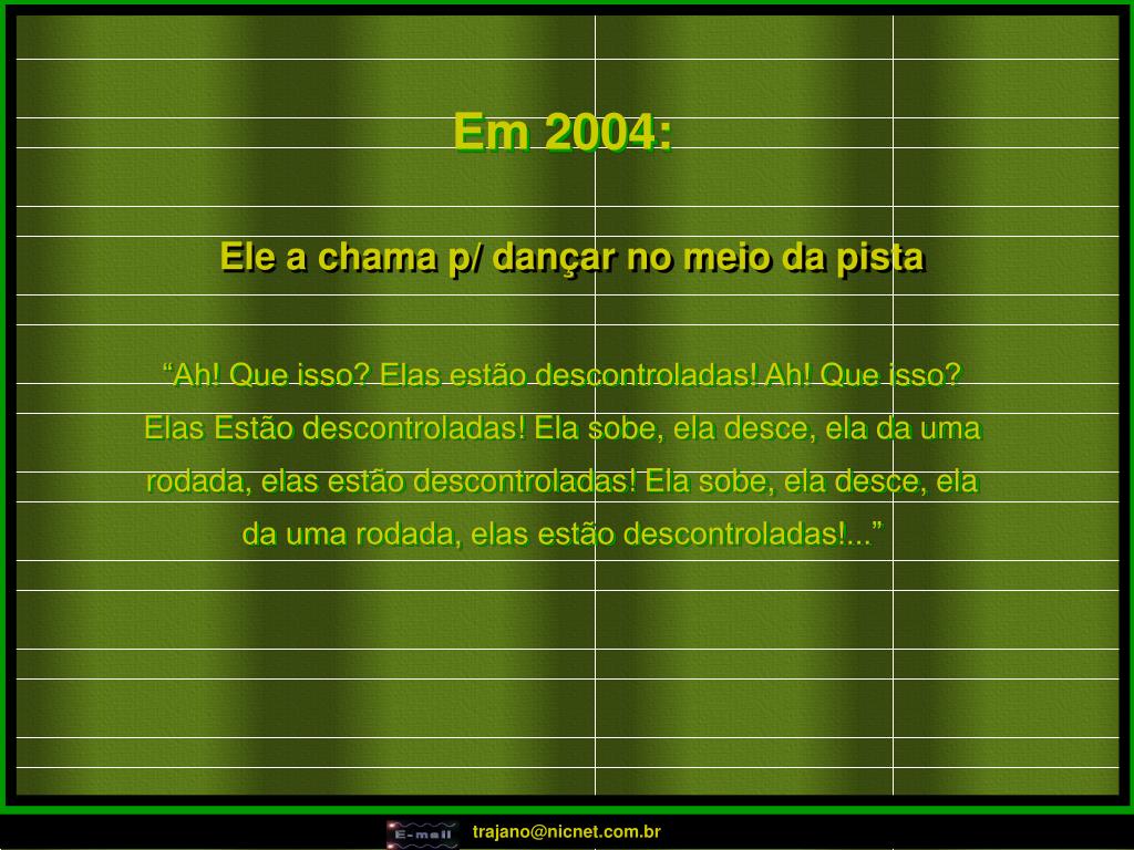 Em 2004: Ele a chama p/ dançar no meio da pista “Ah! Que isso? Elas estão descontroladas! Ah! Que isso? Elas Estão descontroladas! Ela sobe, ela desce, ela da uma rodada, elas estão descontroladas! Ela sobe, ela desce, ela da uma rodada, elas estão descontroladas!...”