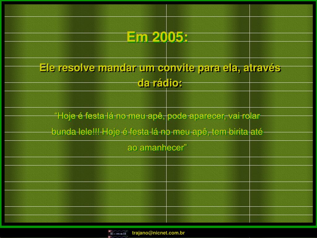 Em 2005: Ele resolve mandar um convite para ela, através da rádio: “Hoje é festa lá no meu apê, pode aparecer, vai rolar bunda lele!!! Hoje é festa lá no meu apê, tem birita até ao amanhecer”