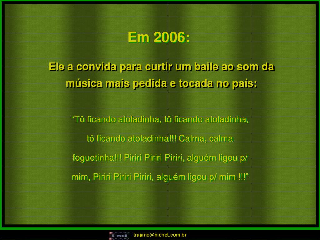 Em 2006: Ele a convida para curtir um baile ao som da música mais pedida e tocada no país: “Tô ficando atoladinha, tô ficando atoladinha, tô ficando atoladinha!!! Calma, calma foguetinha!!! Piriri Piriri Piriri, alguém ligou p/ mim, Piriri Piriri Piriri, alguém ligou p/ mim !!!”
