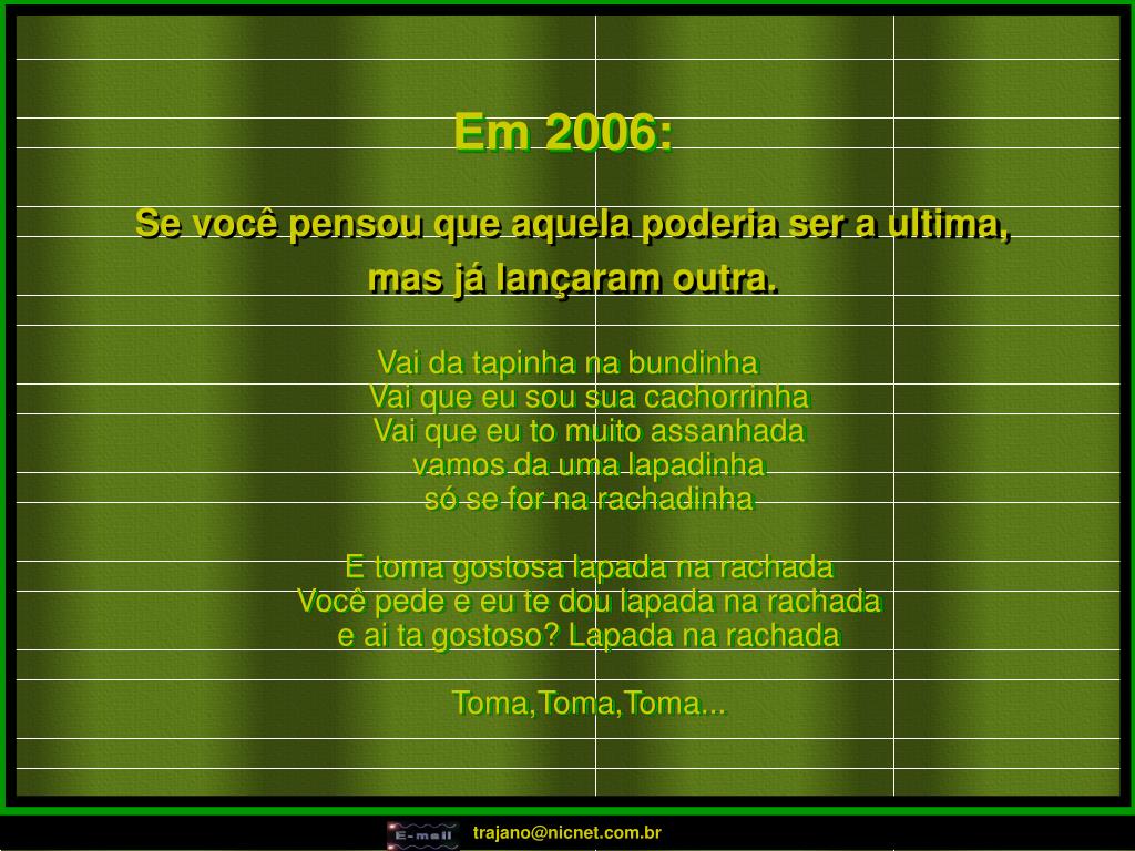Vai da tapinha na bundinhaVai que eu sou sua cachorrinhaVai que eu to muito assanhadavamos da uma lapadinhasó se for na rachadinhaE toma gostosa lapada na rachadaVocê pede e eu te dou lapada na rachadae ai ta gostoso? Lapada na rachadaToma,Toma,Toma... Em 2006: Se você pensou que aquela poderia ser a ultima, mas já lançaram outra.
